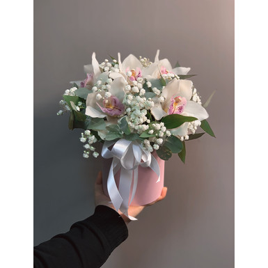 Самый уникальный цветок созданный природой, растет лианой в тропических районах земли, при этом самый стойкий, имеет стебель цветка не более 8см, питается водой в капсуле. Состав: Цимбидиум в капсуле 5 шт Эвкалипт 5шт Гипсофила 1шт Цилиндр 14х14 - 1шт ...