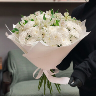 Состав: Хризантема алтай 3 веточки Упаковка корейская пленка дымка Атласная лента